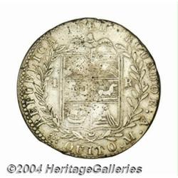 Republic. 4 Reales 1844MV-A, KM27, VF with significant hair detail on Bolivar and a clearly visible "A" on the condor's chest. Struck on a faulty planchet resulting in numerous small flaws on both sides, and lightly cleaned. Still well above average for this rare and very popular type.From the Morris Geiger Collection. Important notice: Heritage usually auctions material at the rate of 200-250 lots per hour. On some occasions eBay Live bid software or the Internet may not be able to keep up with the pace of the auction. We recommend placing a realistic absentee bid now as insurance to avoid disappointment. Occasionally the auctioneer may eliminate or reject an eBay Live bid, and the auctioneer may also reopen a lot after the close of the eBay live bidding (usually because we missed an audience bid), and may reject your bid even if it shows you as the winning bidder. By bidding via eBay Live, you agree that Heritage may award the lot to another bidder at its sole discretion under the circumstances described above or any other reasonable circumstances. Also please note that all Heritage lots purchased through eBay Live carry a 20% Buyer's Premium. Please make sure you read the Terms and Conditions before you bid.