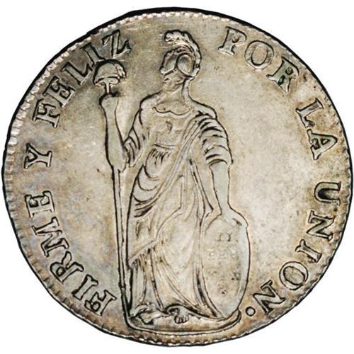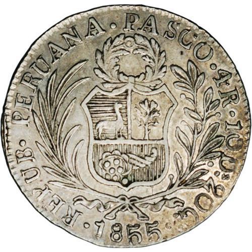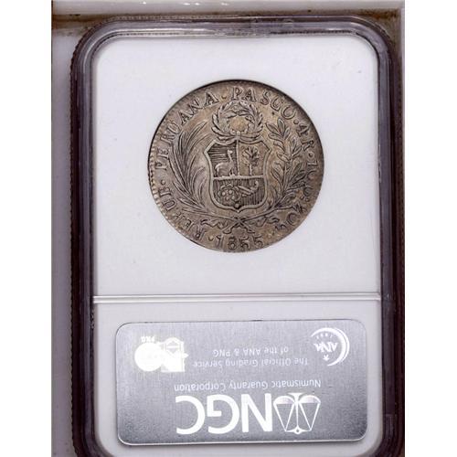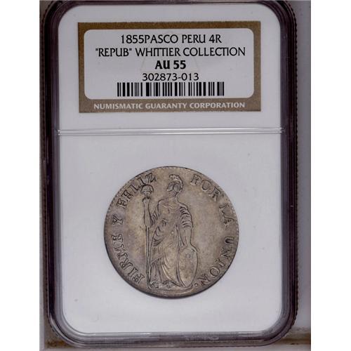 Republic 4 Reales 1855 Pasco, KM151.8, AU55 NGC, lightl Republic 4 Reales 1855 Pasco,