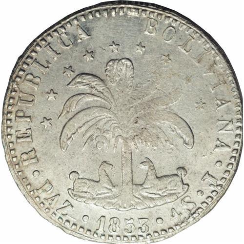 Republic 4 Soles 1853-J Paz, KM125, MS62 NGC, Potosi st Republic 4 Soles 1853-J Paz,