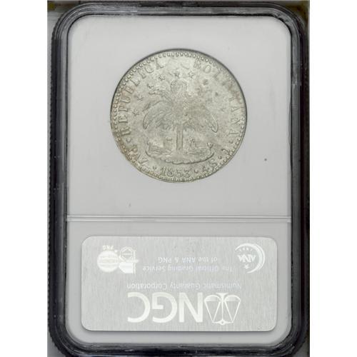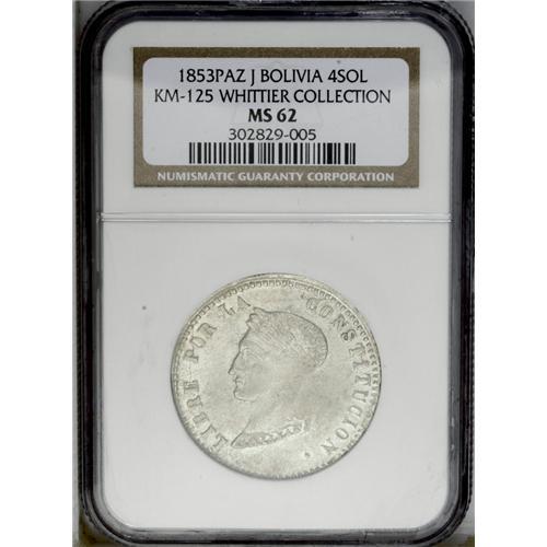 <B>Republic 4 Soles 1853-J Paz, </B></I>KM125, MS62 NGC, Potosi style laureate bust, crudely produced but a highly lustrous example with no circulation wear. Very rare in this quality.