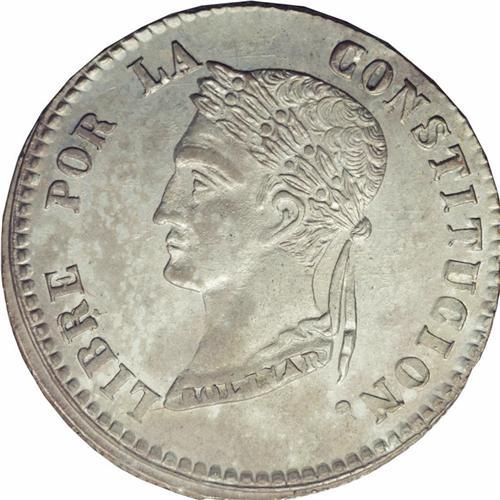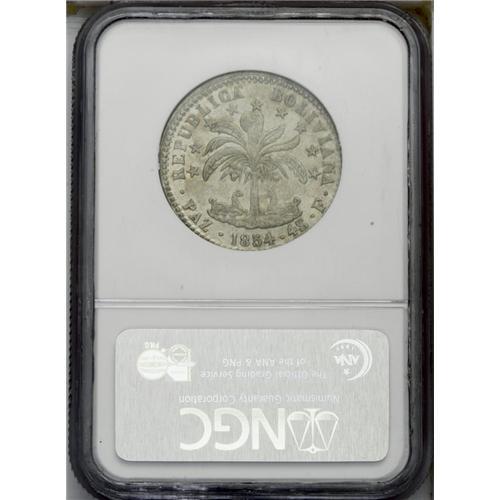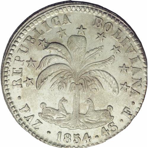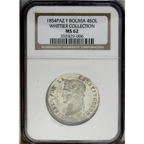 <B>Republic 4 Soles 1854-F Paz, </B></I>KM125, MS62 NGC, lightly toned with unexpectedly sharp details on both sides. Very scarce grade.