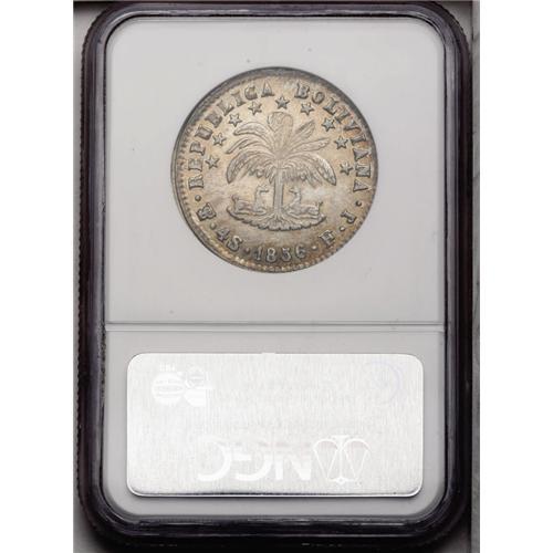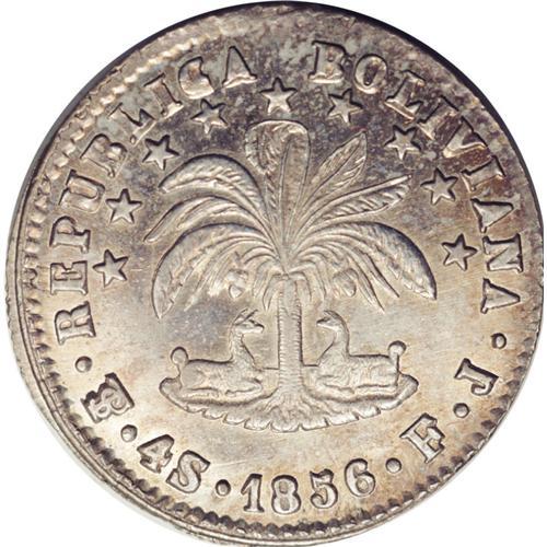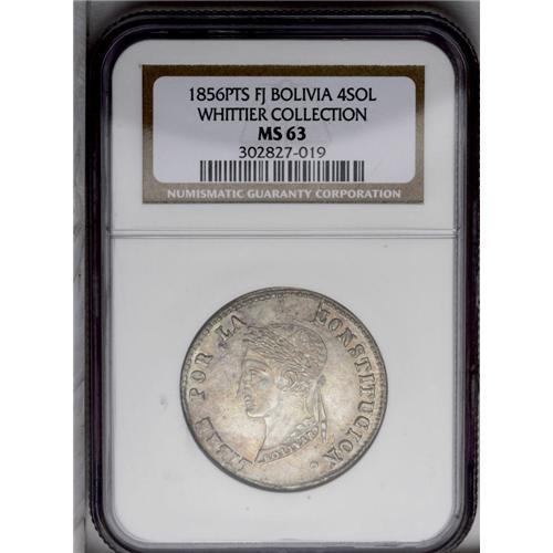 <B>Republic 4 Soles 1856-FJ, </B></I>KM123.2, MS63 NGC, extremely sharp details, nicely toned and rare in this quality.