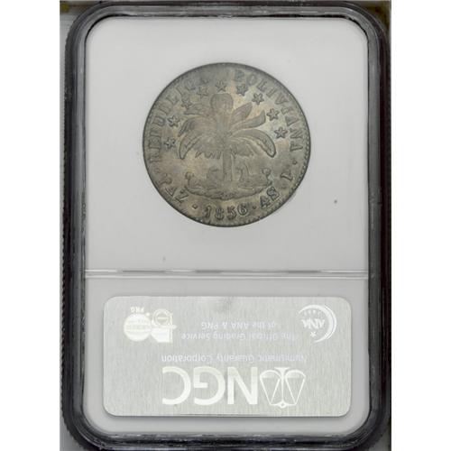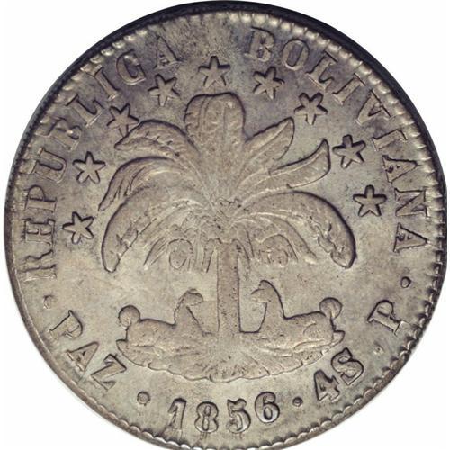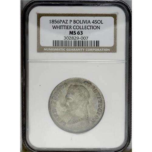 <B>Republic 4 Soles 1856-P Paz, </B></I>KM130, MS63 NGC, very attractive with gray and gold patina. Rarely encountered in this desirable condition.