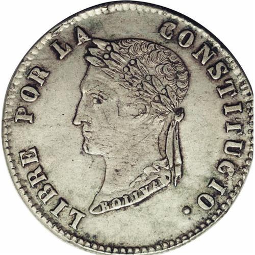 <B>Republic 4 Soles 1857-FJ, </B></I>KM123.2, XF45 NGC, rare error spelling CONSTITUCIO with the final N omitted. Strong bust details.