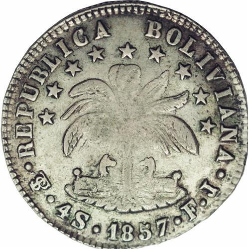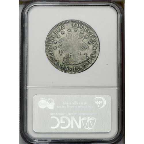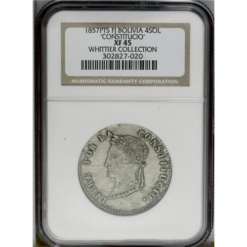 Republic 4 Soles 1857-FJ, KM123.2, XF45 NGC, rare error Republic 4 Soles 1857-FJ,