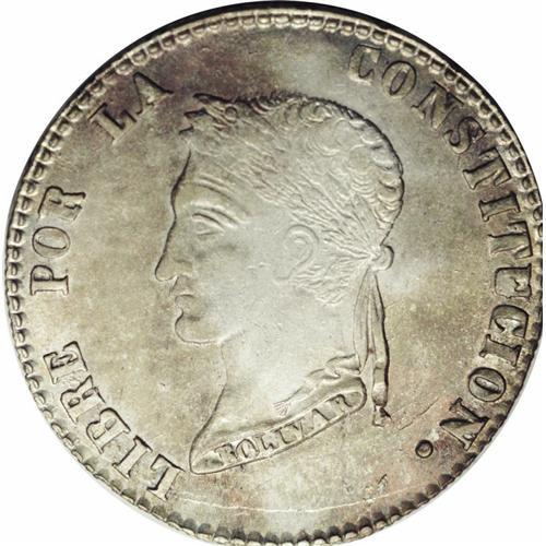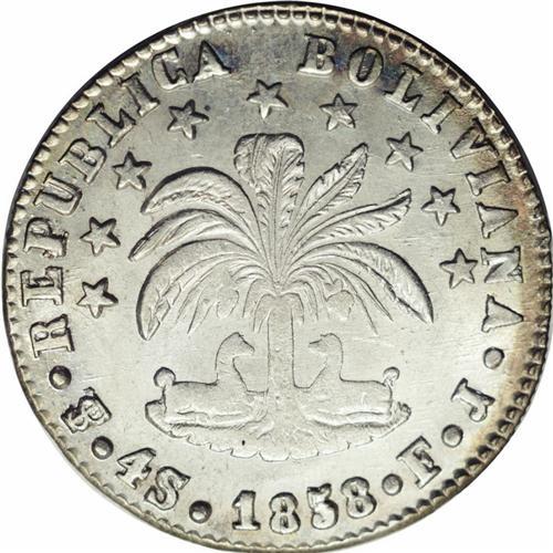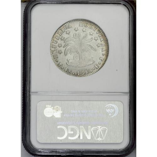 <B>Republic 4 Soles 1858-FJ, </B></I>KM123.2, AU58 NGC, a choice example with a particularly attractive obverse (tree side.)