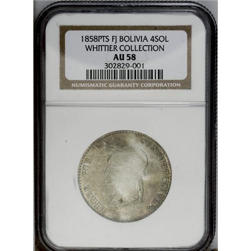 Republic 4 Soles 1858-FJ, KM123.2, AU58 NGC, a choice e Republic 4 Soles 1858-FJ,