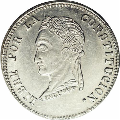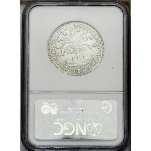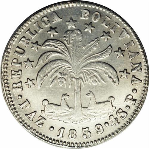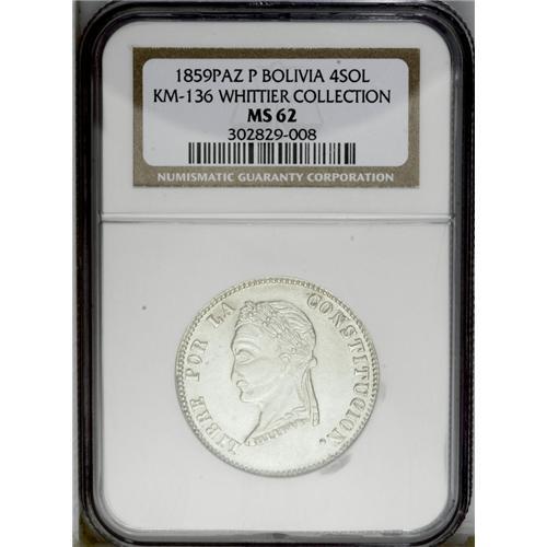 <B>Republic 4 Soles 1859-P Paz, </B></I>KM136, MS62 NGC, an attractive coin with virtually full mint luster and strong detail details. A very scarce type in rare quality.