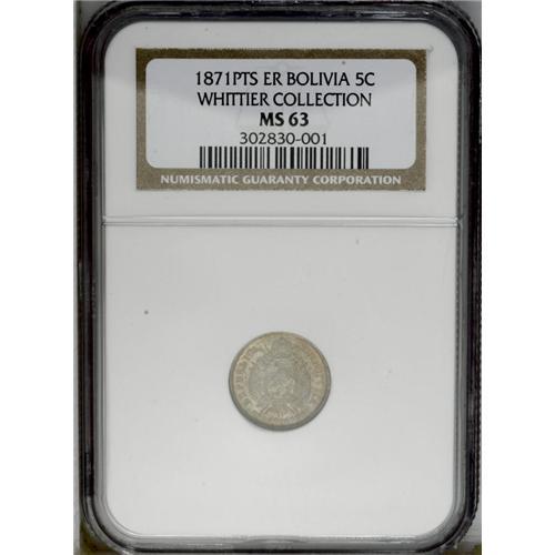 <B>Republic 5 Centavos 1871-ER, </B></I>KM156.1, MS63 NGC, lightly toned, the obverse is particularly superb. Variety with dots to either side of the PTS monogram. Rare grade!