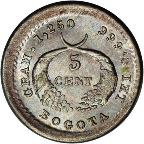 <B>Republic 5 Centavos 1880 Bogota, </B></I>KM174a.1, MS65 NGC, superbly toned with subtle lilac-gray patina and completely lustrous surfaces. A fully original little jewel!