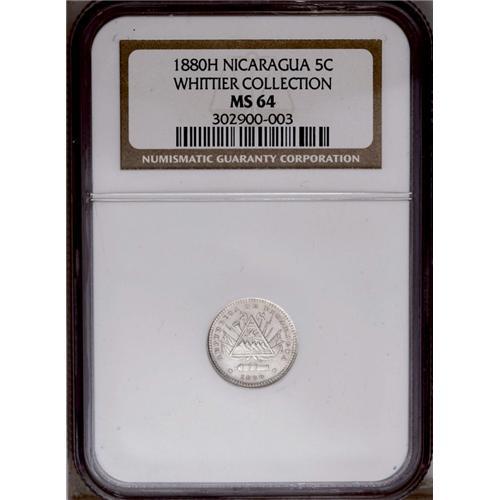 <B>Republic 5 Centavos 1880H, </B></I>KM2, MS64 NGC, fully lustrous.