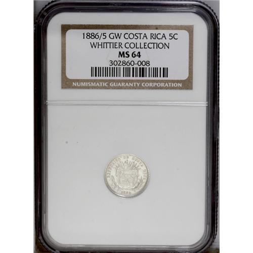 <B>Republic 5 Centavos 1886/5-GW, </B></I>KM125, MS64 NGC, razor sharp details and full mint brilliance, bold overdate.