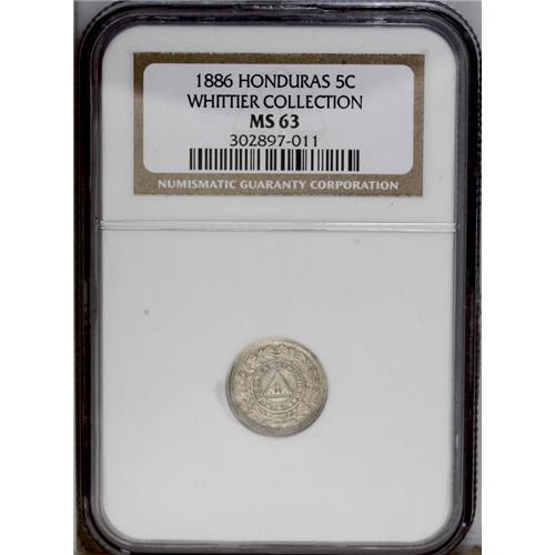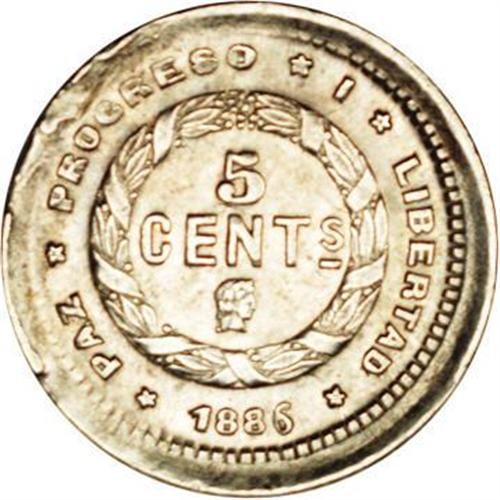 <B>Republic 5 Centavos 1886, </B></I>KM48, MS63 NGC, an incredibly sharply struck example with abundant mint luster. Rare quality for this type.