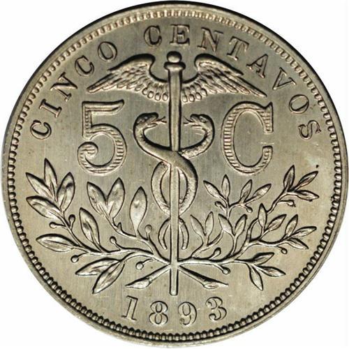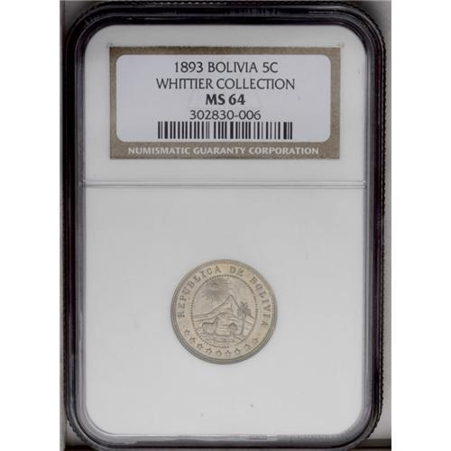 <B>Republic 5 Centavos 1893, </B></I>KM173.1, MS64 NGC, a choice, virtually specimen quality example, very elusive in this quality.