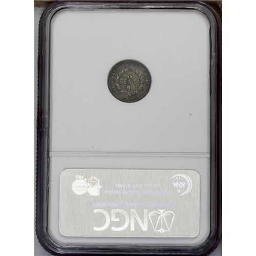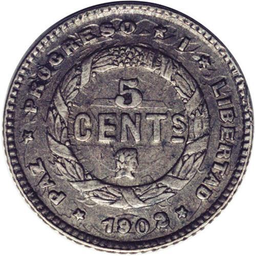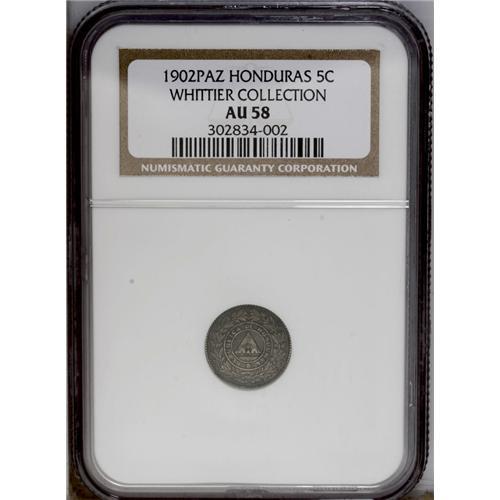 <B>Republic 5 Centavos 1902, </B></I>KM48, AU58 NGC, light pewter gray toning with very bold and evenly defined details. Rare date and condition.