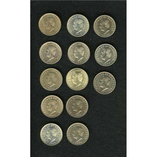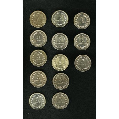 <B>Republic 5 Centavos Date Run, </B></I>thirteen different dates, all UNC including: 1920, 1921, 1925, 1940, 1944, 1948, 1951, 1952, 1956, 1959, 1963, 1972 and 1974. The first three dates are very scarce in mint state. <B>Sold as is, no return lot.</B></I>