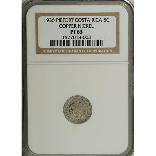<B>Republic 5 Centimos Piefort Pattern 1936 in copper-nickel,</B></I> unlisted in KM, Proof 63 NGC. The only example of this pattern issue that we have seen and possibly unique.<BR><BR><b>Shipping:</b> Coin/Currency (<a target="_blank" href="http://www.heritageauctions.com/common/shipping.php">view shipping information</a>)