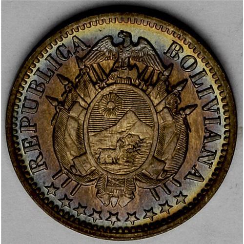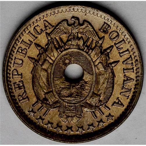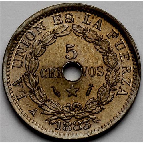 <B>Republic 5 Centavos - Type Tandem, </B></I>KM169.1 1883A, first type without central hole, gem toned UNC, gorgeous, and KM169.2 1883A, central hole, choice brilliant UNC.