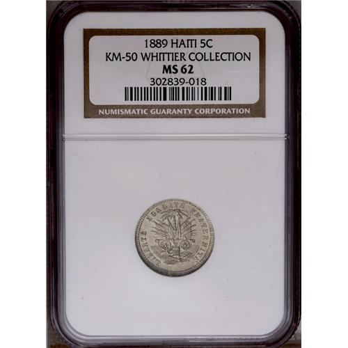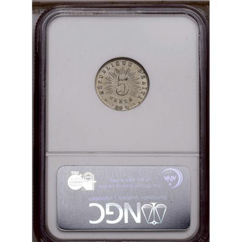 <B>Republic 5 Centimes 1889, </B></I>KM50, MS62 NGC, a nice lustrous example of this scarce one-year type, one tiny spot on the 5.