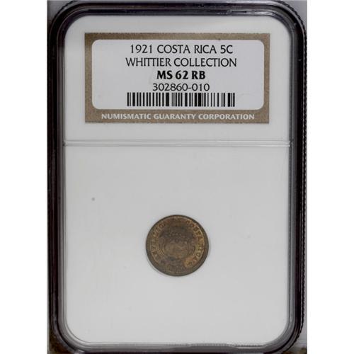 <B>Republic 5 Centimos 1921, </B></I>KM151, MS62 NGC Red & Brown, a lustrous and well-struck example of this key date, rare in mint state.