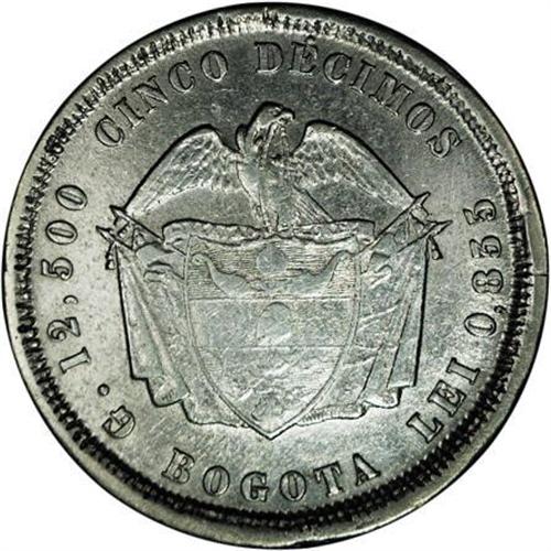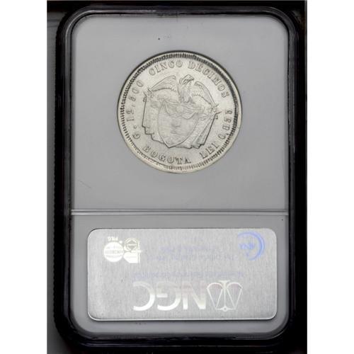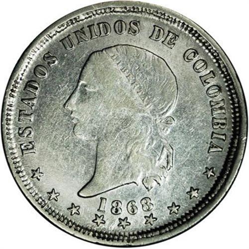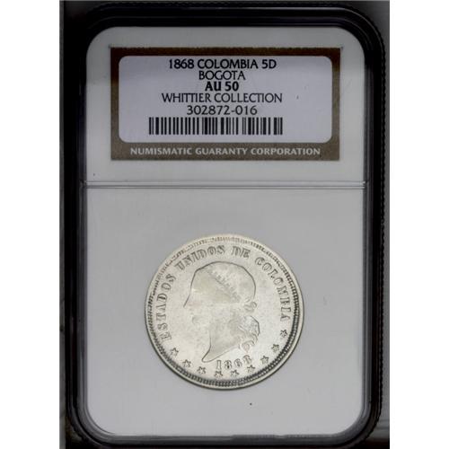 <B>Republic 5 Decimos 1868 Bogota, </B></I>KM153.1, AU50 NGC, evenly struck details with some remaining mint luster. Very scarce and popular first date for this series. BC2.