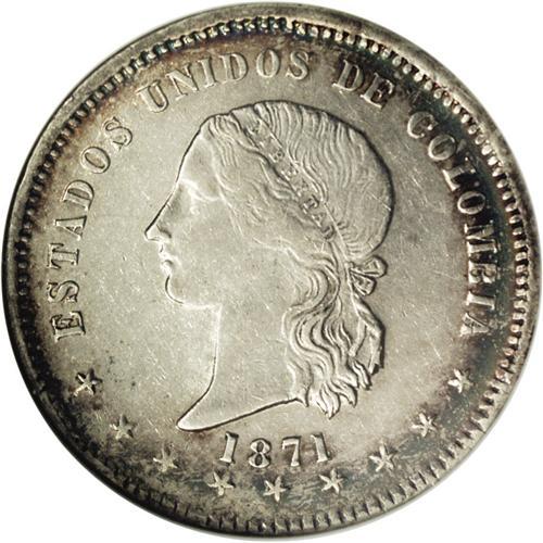 <B>Republic 5 Decimos 1871 Bogota, </B></I>KM153.1, AU55 NGC, nice evenly struck details with toning in the legends. BC5.