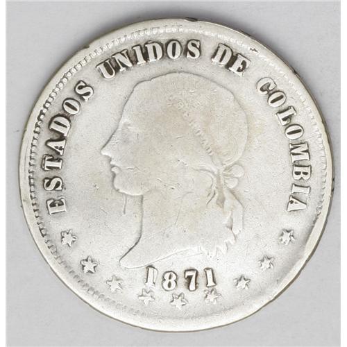 <B>Republic 5 Decimos 1871 Popayan, </B></I>KM153.6, very nice Fine, evenly worn with strong details throughout. The 7 in the date appears to be punched over a 6, but second 1 does not seem to be an overdate. BC-9 although Burnett was not aware of the overdate when his book was published.