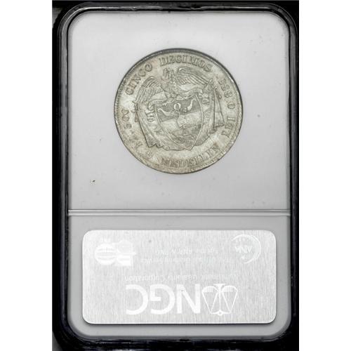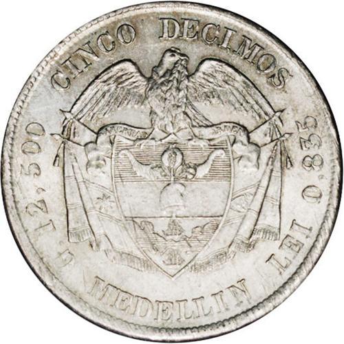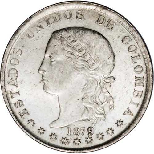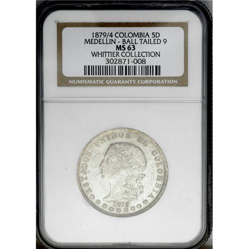 <B>Republic 5 Decimos 1879/4 Medellin, </B></I>KM161.1, MS63 NGC, lightly toned over full mint brilliance, rare quality for this series. BC26a.