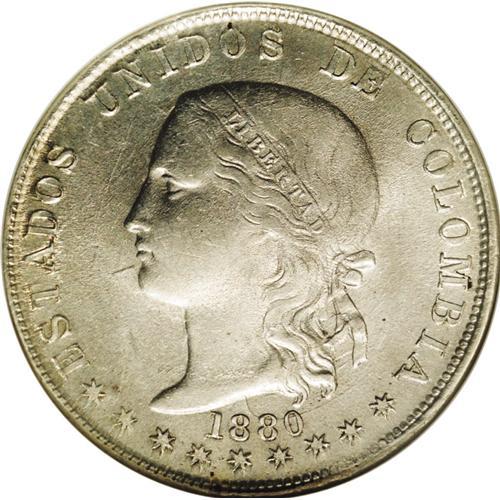 <B>Republic 5 Decimos 1880 Medellin, </B></I>KM161.1, MS64 NGC, extremely sharp details and full mint bloom, one of the highest graded Colombian 5 Decimos known. BC28.