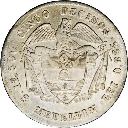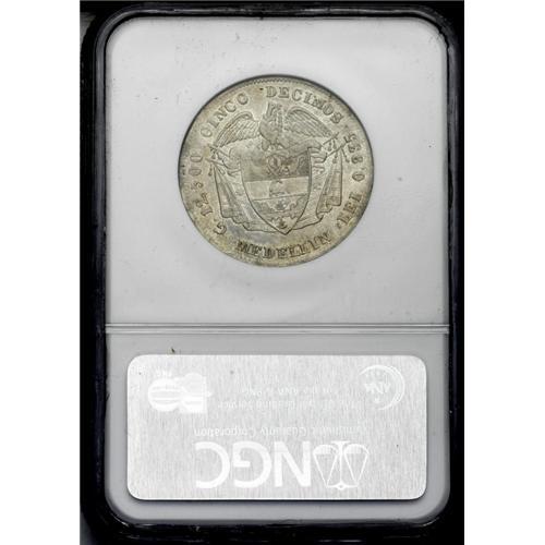 <B>Republic 5 Decimos 1880 Medellin, </B></I>KM161.2, AU55 NGC, light champagne toning with considerable mint luster. The is the very rare large Libertad bust "different effigy" type, only two examples known. This variety had not been discovered at the time that Half Dollars of Colombia was published, but would be listed just before BCA35, the same variety dated 1883.