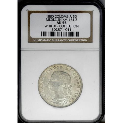 Republic 5 Decimos 1880 Medellin, KM161.2, AU55 NGC, li Republic 5 Decimos 1880 Medellin,