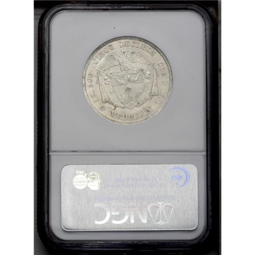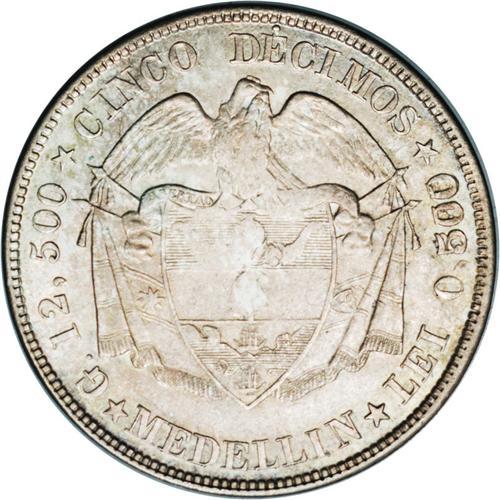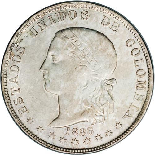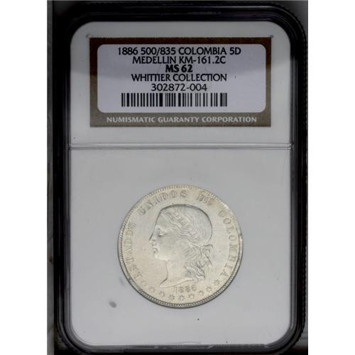 <B>Republic 5 Decimos 1886 Medellin, </B></I>KM161.2b, MS62 NGC, a truly superb coin with unusually problem-free surfaces, boldly executed design details and full mint brilliance. Large bust type with no reverse stars and 500 over 835 fineness. BC36c. Extremely rare quality and a most desirable example.
