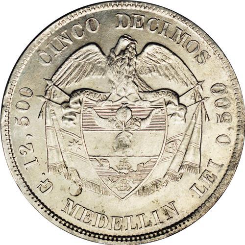 Republic 5 Decimos 1886 Medellin, KM161.2c, AU58 NGC, a Republic 5 Decimos 1886 Medellin,