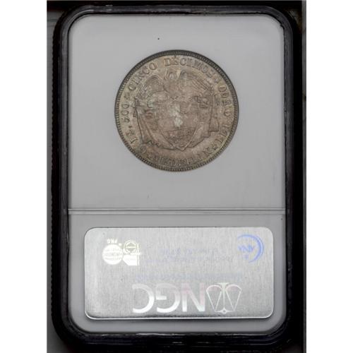 <B>Republic 5 Decimos 1886 Medellin, </B></I>KM161.2c, AU58 NGC, a lovely coin with light patina and considerable mint bloom. Large Libertad bust, seven-pointed stars on the obverse, four stars reverse and clearly 500 over 835 fineness. The SCWC states that this type has eight-pointed stars on the obverse. The illustration in Burnett (BC36d) indicates that the stars should in fact be seven-pointed. Very rare grade for this type and believed to be the finest known.