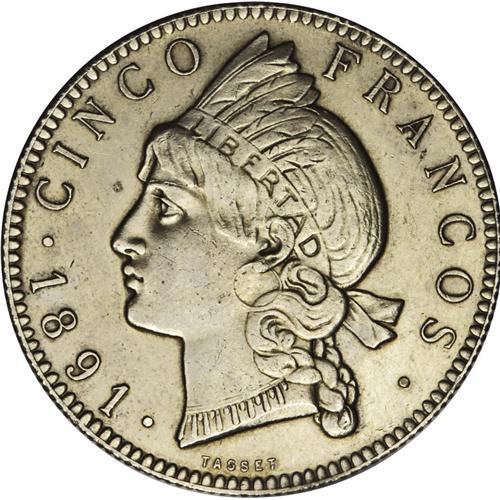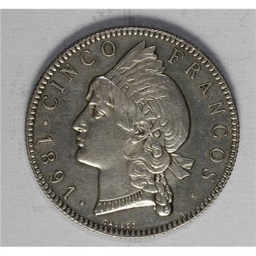 <B>Republic 5 Francos 1891A, </B></I>KM12, sharp AU, very lightly cleaned with vague hairlines in the fields, still an attractive example with considerable original luster.<BR><I>From the Monedas Oro Collection</B></I><BR><BR><b>Shipping:</b> Coin/Currency (<a target="_blank" href="http://www.heritageauctions.com/common/shipping.php">view shipping information</a>)