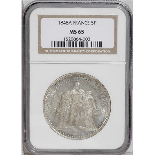 <B>Republic 5 Francs 1848-A, </B></I>KM756.1, MS65 NGC, a superb original coin with light patina over full frosty white mint brilliance.