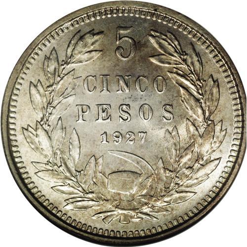 Republic 5 Pesos 1927, KM173.1, MS65 NGC, unusually nic Republic 5 Pesos 1927,