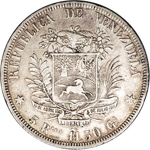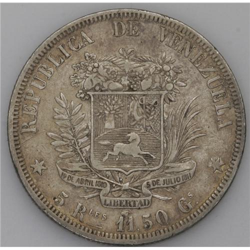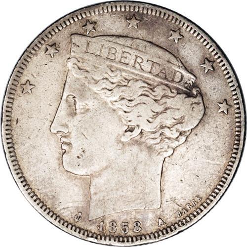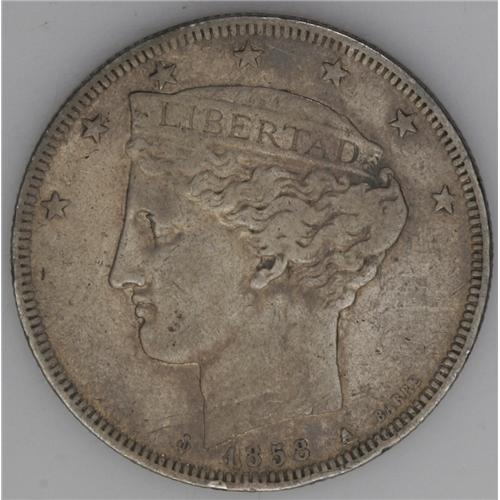 <B>Republic 5 Reales 1858A, </B></I>KM-Y11, toned VF, two tiny rim nicks below the date, barely noticeable. Very scarce grade for this ever-popular silver type.