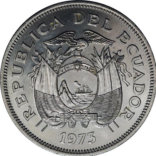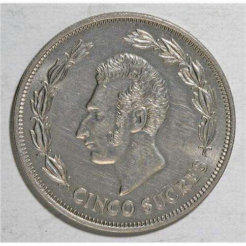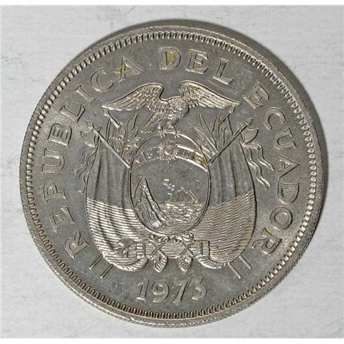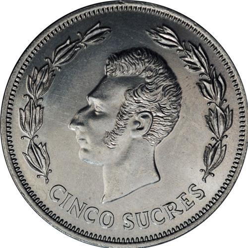 <B>Republic 5 Sucres 1973, </B></I>KM84, choice brilliant UNC, extremely rare type. Although 500 pieces were originally minted, all but 15 were melted. Of those fifteen examples, seven were distributed to government officials, and eight (five canceled) were given to the Central Bank Collection. A true modern rarity in a very popular series.<BR><BR><b>Shipping:</b> Coin/Currency (<a target="_blank" href="http://www.heritageauctions.com/common/shipping.php">view shipping information</a>)