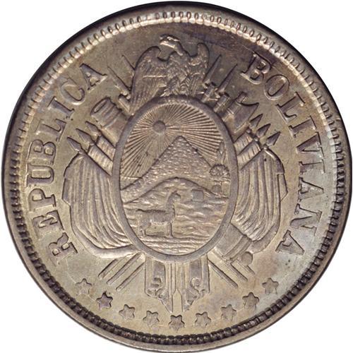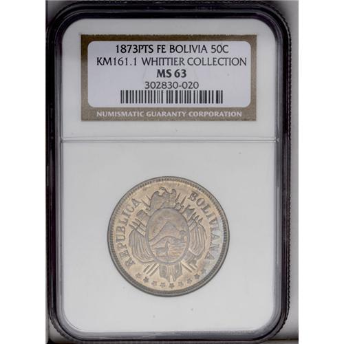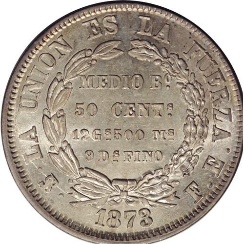 <B>Republic 50 Centavos 1873-FE, </B></I>KM161.1, MS63 NGC, lightly toned with abundant mint luster. First type with 12 Gs. Very rare quality for this type.