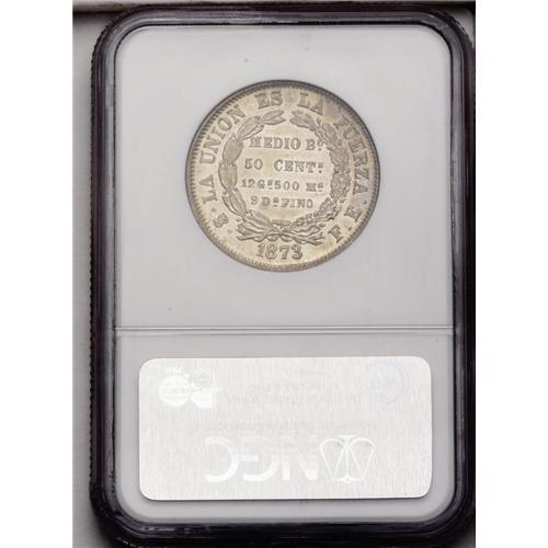 Republic 50 Centavos 1873-FE, KM161.1, MS63 NGC, lightl Republic 50 Centavos 1873-FE,