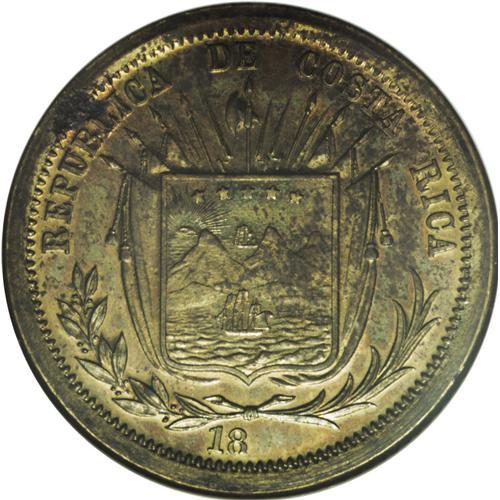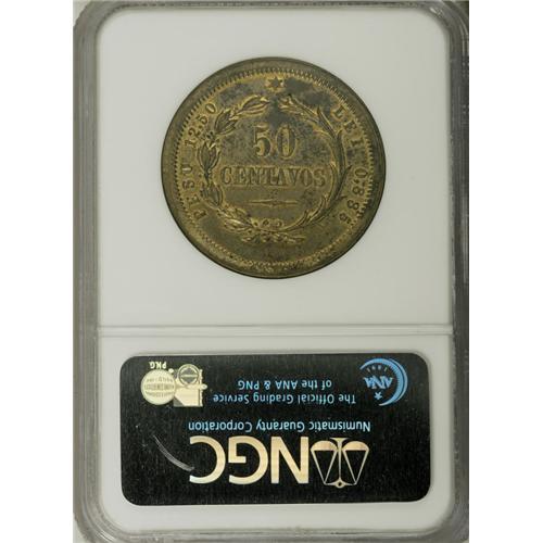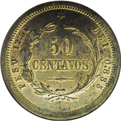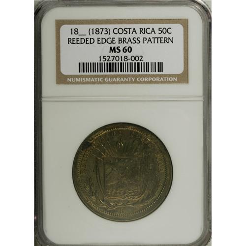 <B>Republic 50 Centavos Pattern in Brass with unfinished date 18-- (1873),</B></I> Reeded Edge, MS60 NGC. Lustrous with a flan flaw at 10 o'clock on the obverse. All other known examples of this type pattern in brass have a plain edge. Possibly unique.<BR><BR><b>Shipping:</b> Coin/Currency (<a target="_blank" href="http://www.heritageauctions.com/common/shipping.php">view shipping information</a>)