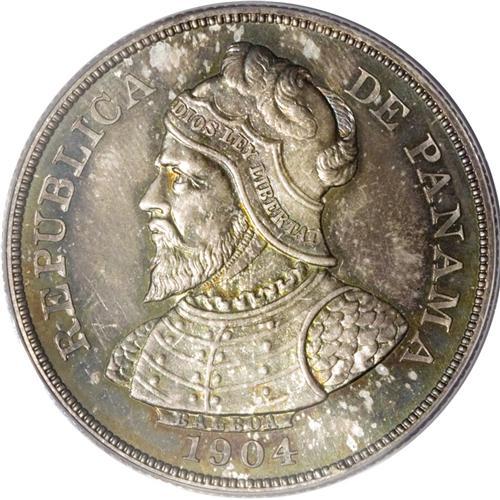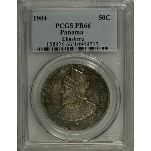 <B>Republic 50 Centesimos 1904, </B></I>KM5, Proof 66 PCGS Eliasberg, beautiful multi-hued toning over fully mirrored surfaces. An incredible coin to behold and a classic rarity in the Latin American series. Only 12 pieces were struck in Proof, and this example is certainly among the finest known.<BR><I>From the Louis E. Eliasberg, Sr. Collection</B></I><BR><BR><b>Shipping:</b> Coin/Currency (<a target="_blank" href="http://www.heritageauctions.com/common/shipping.php">view shipping information</a>) <BR><BR><B>Important notice: