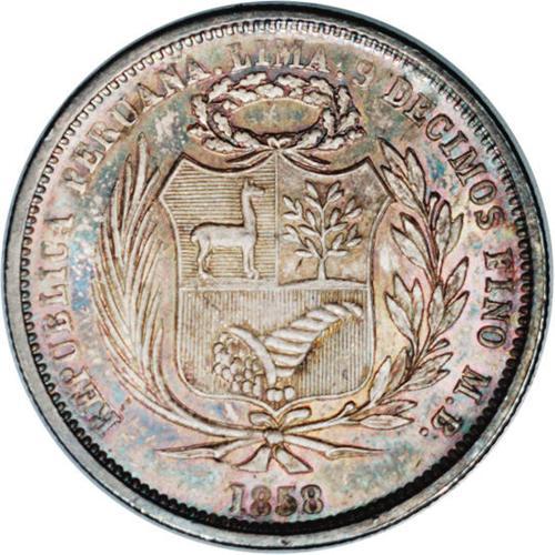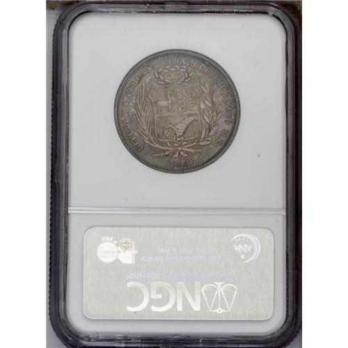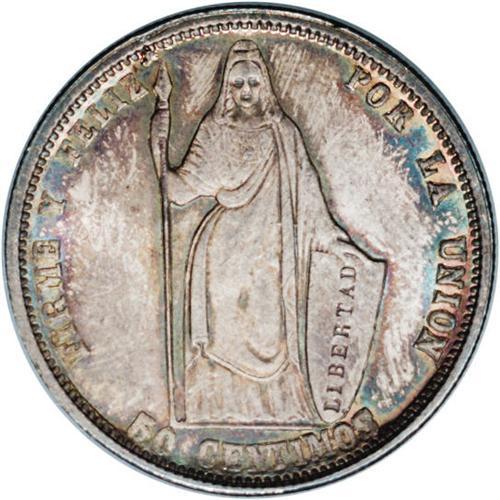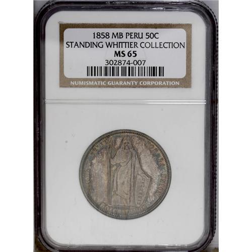 <B>Republic 50 Centimos 1858-MB, </B></I>KM178, MS65 NGC, a superbly toned example of this one-year type with full underlying mint luster and excellent overall eye appeal - very rare in this quality.