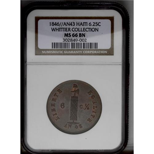 Republic 6 1/4 Centimes 1846-An 43, KM29, MS66 NGC Brow Republic 6 1/4 Centimes 1846-An 43,