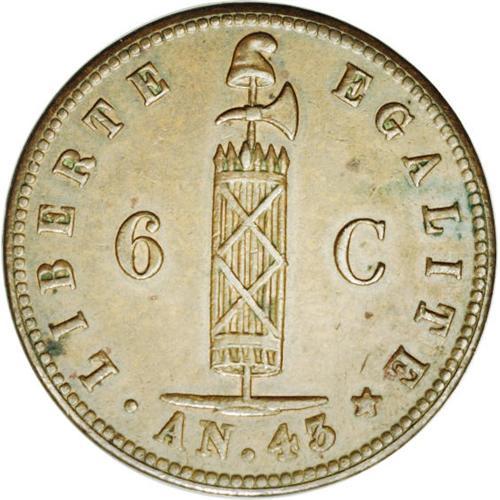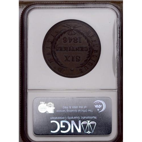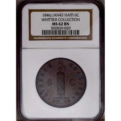 <B>Republic 6 Centimes 1846-An 43, </B></I>KM28, MS62 NGC Brown, a very attractive large copper coin with deep chocolate brown sheen. Very scarce this nice.