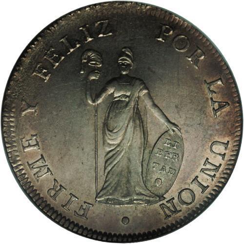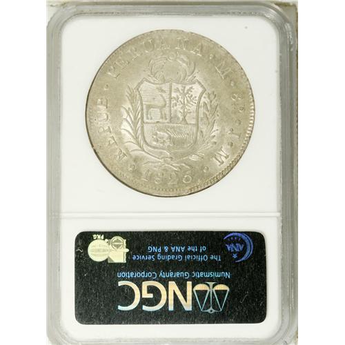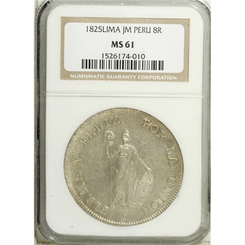 <B>Republic 8 Reales 1825-JM Lima, </B></I>KM142.1, MS61 NGC, exceptionally well-struck, very scarce first date of this series.<BR><BR><b>Shipping:</b> Coin/Currency (<a target="_blank" href="http://www.heritageauctions.com/common/shipping.php">view shipping information</a>)