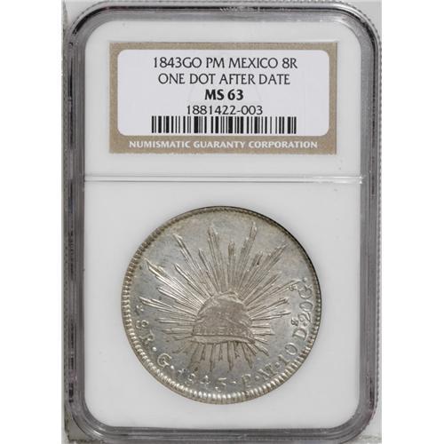 <B>Republic 8 Reales 1843-Go-PM, </B></I>KM377.8, MS63 NGC, one dot after date.