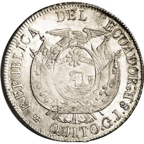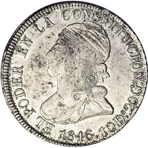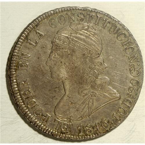 <B>Republic 8 Reales 1846-GJ, </B></I>KM32, toned AU-UNC, an original example of this rare Latin crown with deep gray and gold patina over sparkling mint luster. The strike is a bit weak at the centers and the obverse displays some minor flaws including a planchet flake on the bust of Libertad. Very rare and desirable in this select quality.<BR><I>From the Shinholser Collection</B></I><BR><BR><b>Shipping:</b> Coin/Currency (<a target="_blank" href="http://www.heritageauctions.com/common/shipping.php">view shipping information</a>)