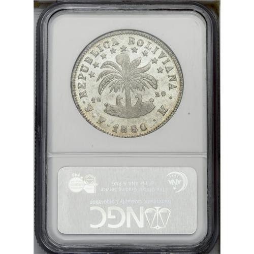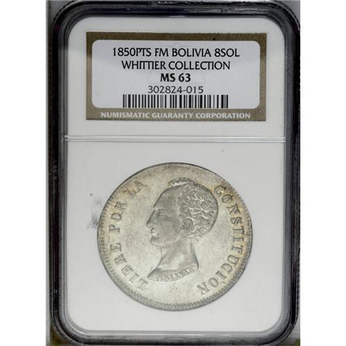 <B>Republic 8 Soles 1850-FM, </B></I>KM109, MS63 NGC, fully lustrous and very attractive with just a wisp of golden toning emerging in the legends.